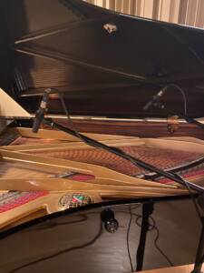 Placed on a rug to minimize floor reflections, lid fully open. Close mic: 2x KM-184, one on low strings, one on high strings; 30cm above strings, in cardioid pattern. I used this technique to record stereo in a natural way. It will capture the sound character of the different parts of the strings.