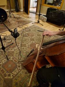 The microphone was placed at a slight angle towards the bridge of the cello, it was especially important to capture the lower frequencies of the cello, about 50-70 cm away from the body of the cello. I used AKG’s sensitive and wide-aperture response.